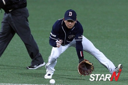 '2013 한국야쿠르트 세븐프로야구' 삼성 라이온즈와 두산 베어스의 한국시리즈 2차전 경기가 25일 오후 대구구장에서 열린 가운데 두산 손시헌이 7회말 1사 무루 상황 진갑용의 타구를 잡고 있다.