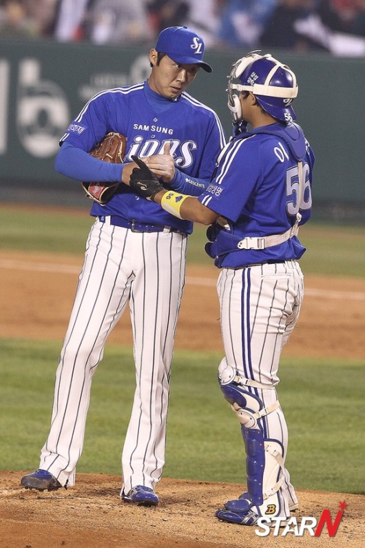 '2013 한국야쿠르트 세븐프로야구' 두산 베어스와 삼성 라이온즈의 한국시리즈 4차전 경기가 28일 오후 잠실구장에서 열린 가운데 삼성 배영수, 이지영이 대화를 나누고 있다.