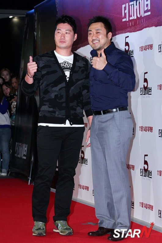삼성 라이온즈 오승환과 배우 마동석이 8일 오후 서울 성동구 행당동에 위치한 CGV 왕십리에서 열린 영화 ‘더 파이브’ VIP시사회에 참석해 포즈를 취하고 있다.