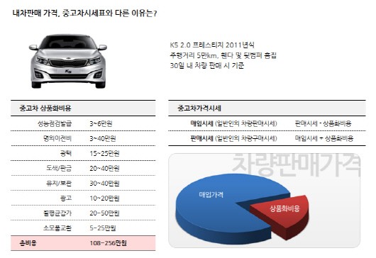 내차팔때 소비자가 제시 받는 중고차가격은 위와 같은 비용과 법정수수료 등 이윤을 고려한 것이다. 그래서 소비자 판매가와 차이가 발생하는 것이다. 우리나라 중고차 딜러의 이윤이 일본 대비 5~10% 수준임을 감안하면, 일반적인 경우 중고차딜러의 과다한 이익추구로 내가 받을 수 있는 차량가격이 낮아진다고 보기는 힘들다.