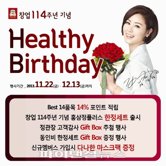 인삼공사는 오는 22일부터 다음달 13일까지 정관장 구매고객에게 다양한 혜택을 제공하는 '정관장 창업 114주년 헬시 버스데이' 이벤트를 진행한다고 20일 밝혔다.