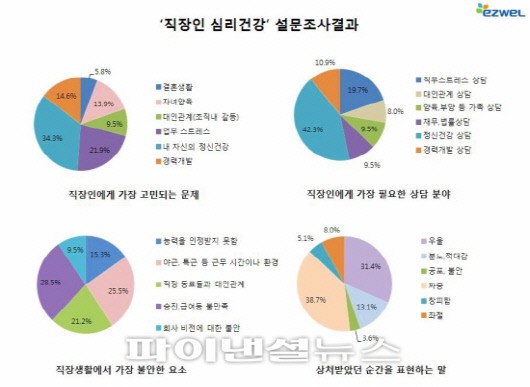 이지웰페어는 25일 정신건강과 상담서비스(EAP)를 주제로 해 현재 가장 고민되는 문제'에 대하여 959명의 직장인을 대상으로 실시한 설문조사 결과, 직장인 34.3%가 "내 자신의 정신건강"이라고 답하여 가장 많았다. 이번 설문에서는 정신건강에 이어 직장인은 업무 스트레스(21.9%)에 대한 고민을 호소했고 경력개발(14.6%), 자녀양육(13.9%) 관련 문제들도 높은 것으로 조사됐다.