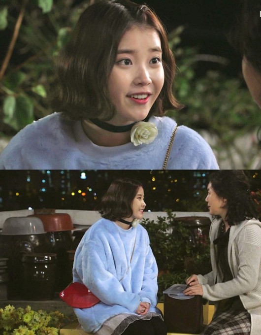 앞서 지난 1회 방송분에서 아이유는 외출할 때면 항상 목에 다는 코사지와 함께 하늘색 퍼 맨투맨 티셔츠를 스타일링했다.
