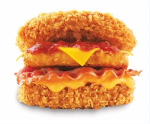 이번에 출시된 '징거더블다운맥스'는 매콤한 치킨 필렛 사이에 슬라이스 치즈와 베이컨, 치즈소스와 살사소스가 어우러져 매콤한 맛을 느낄 수 있다. 이번에는 해시브라운을 넣어 한층 더 푸짐하게 즐길 수 있다.