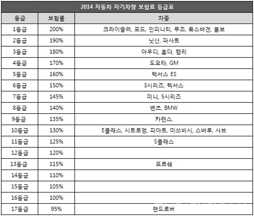 이에 따라 현재 1등급인 폭스바겐, 포드, 볼보, 크라이슬러, 인피니티 등의 할증률은 50% 오른다. 올해까지는 150%를 냈지만 내년부터는 200%를 내야 하는 것이다.