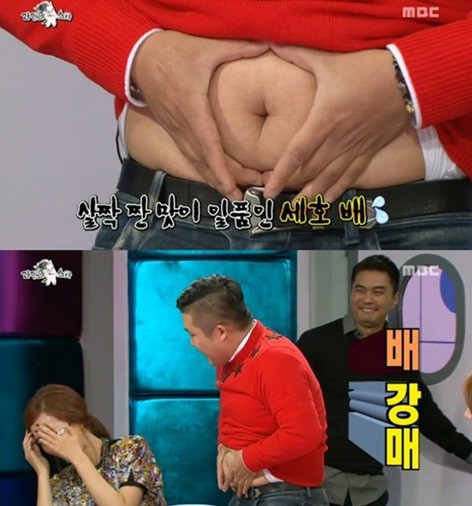이어 MC 김구라는 "배 개인기를 보여달라"라며 적극 추천했고 그 자리에서 일어선 조세호는 진짜 자신의 배를 손으로 잡아 과일로 배를 표현하는 이른바 ‘배 개인기’를 선보였다.