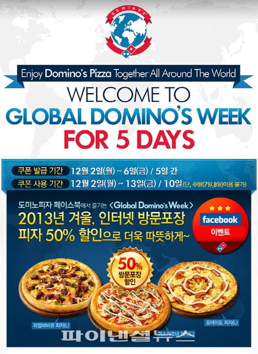 도미노피자가 오는 6일까지 전세계 42개국과 함께 피자를 50% 할인하는 세계 최대 규모의 '글로벌 도미노 위크'를 페이스북을 통해 개최한다고 2일 밝혔다.