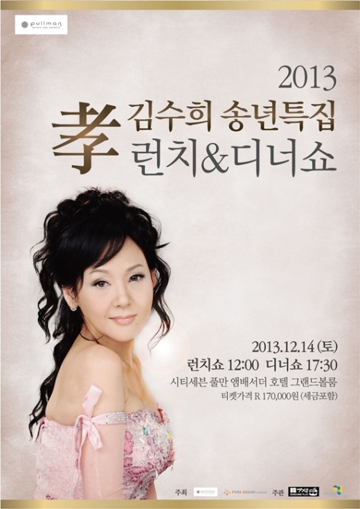 한편 '2013년 김수희 송년특집 孝 런치&디너쇼'는 14일 오후 12시와 5시 30분, 총 2회에 걸쳐 진행 된다.