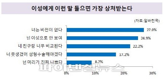 이어 '너는 이성으로 안보여"(24.9%)가 2.1%포인트의 근소한 차이로 상처받는 말 2위에 올랐고 3위는 '네 친구랑 너무 비교된다'(22.2%)인 것으로 나타났다. 그 밖에 '너 못생겼어, 성형수술 해야겠다'(17.2%), '넌 머리가 진짜 나쁘다'(8.7%)등의 말도 이성친구의 자존심을 건드리는 상처받는 말로 뽑혔다. 특히 여성은 '너 성형수술 해야겠다'에 상처받는다는 대답이 20.4%로 남성(13.2%)보다 1.5배 많아 외모 지적에 더욱 민감한 것으로 나타났다.