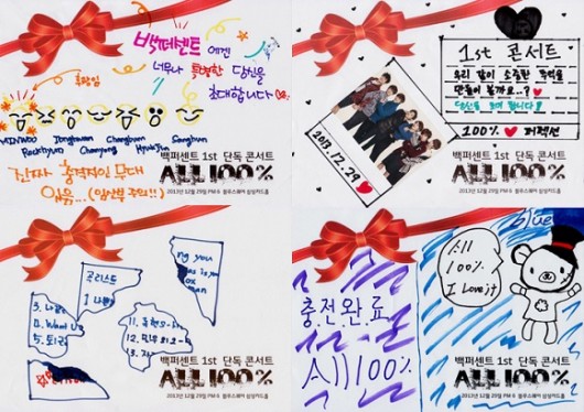 또한 혁진은 백퍼센트의 사진을 폴라로이드 형식으로 꾸며 섬세한 손글씨 실력을 선보였고, 상훈은 콘서트에서 선보일 곡 리스트를 종이가 찢어진 듯한 그림으로 표현했다.