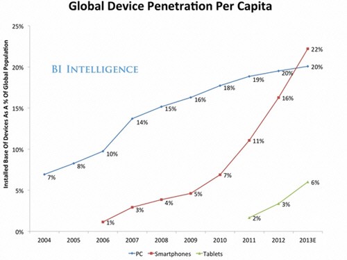 15일(현지시간) 미국 경제전문매체 비즈니스 인사이더는 시장조사기관인 가트너, IDC 등의 자료를 분석한 결과, 올해 말까지 전세계 정보기술(IT) 기기 보급률의 경우 스마트폰은 22%, PC는 20%, 태블릿은 6%를 기록할 것이라고 보도했다.