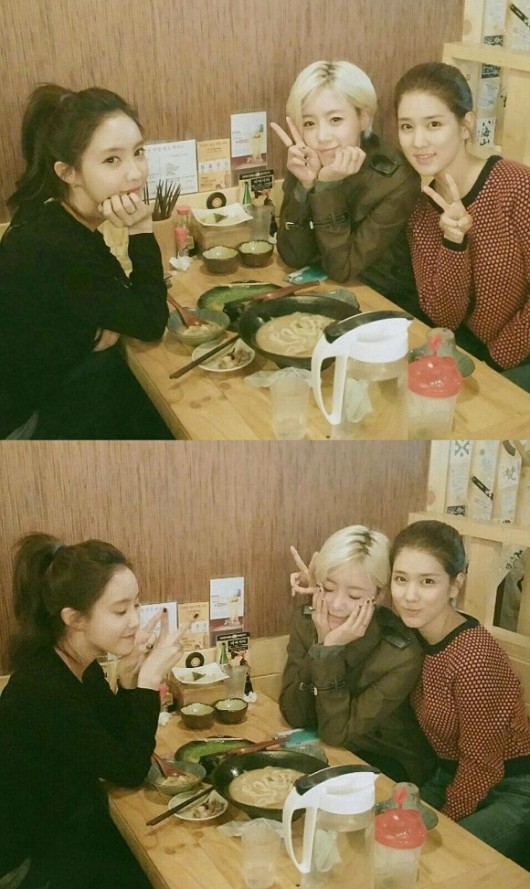 사진 속에서 검은색 니트를 입은 효민은 스피카 양지원, 티아라 은정과 해물우동을 앞에 두고 손가락으로 브이자를 그리는 등 깜찍한 포즈를 취하고 있다.