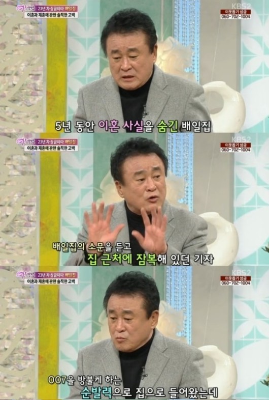 24일 방송된 KBS 2TV '여유만만'에서 배일집은 "지금은 이혼에 대한 시각이 달라졌지만 예전엔 아니었다. 이혼을 한 후 5년 동안 그 사실을 숨겼다"고 입을 열었다.