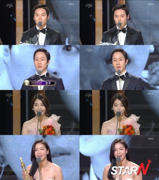 한주완, 정우, 아이유, 경수진이 ‘KBS연기대상’ 남녀 신인상을 받았다.