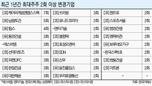 최대주주 변경도 잦았다. 최근 1년간 최대주주가 가장 많이 바뀐 곳은 케이비게임앤앱스스팩으로 총 7회 주인이 변경됐다. 다음으로는 남광토건(5회), 팀스(4회), 동양건설, 에스비엠, 선데이토즈, 파캔OPC, 한일진공, 대한해운, 쓰리원(3회) 등이 최대주주가 바뀌었다.