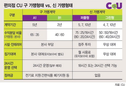 편의점 CU를 운영하는 BGF리테일은 기존 점주의 수익배분율은 최대 65%였으나 최대 80%로 상향하고 운영시간도 점주가 선택할 수 있게 하는 등 새로운 가맹형태를 실시한다.