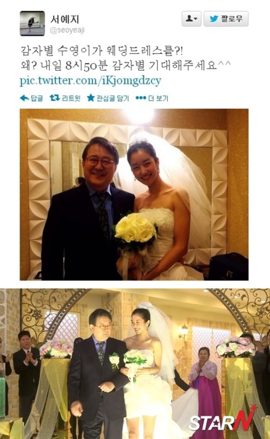 7일 tvN 일일 시트콤 ‘감자별’에 출연중인 서예지는 자신의 트위터를 통해 “감자별 수영이가 웨딩드레스를?! 왜? 내일 8시 50분 감자별 기대해주세요^^”라는 글과 함께 웨딩드레스를 입고 찍은 사진을 공개했다.