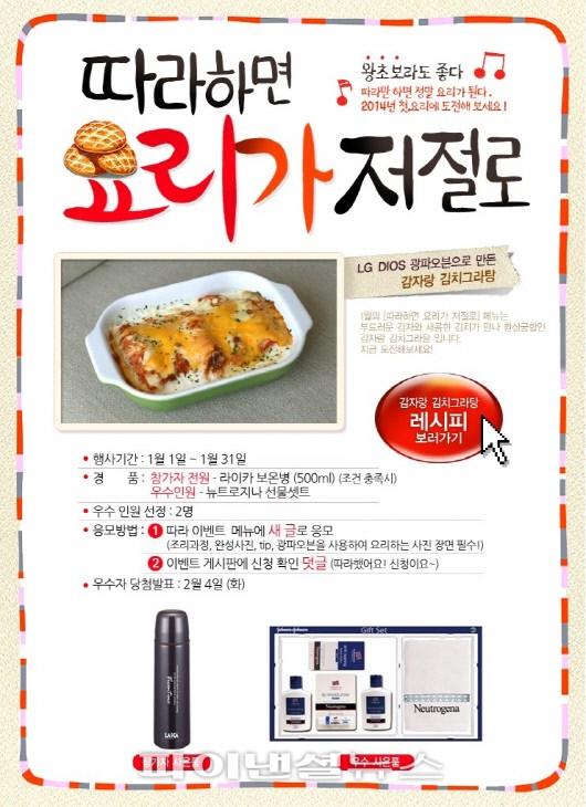 LG전자가 디오스광파오븐의 네이버 카페 '오븐&더레시피'를 통해 레시피를 따라 요리를 만들면 선물을 증정하는 이벤트를 진행한다고 9일 밝혔다.