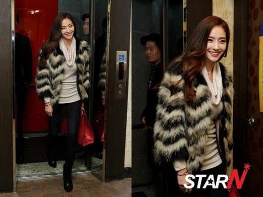 이날 한채영은 타이트한 블랙 스키니진을 착용해 늘씬한 각선미를 강조했으며 퍼 재킷으로 귀품 있는 분위기를 연출했다.
