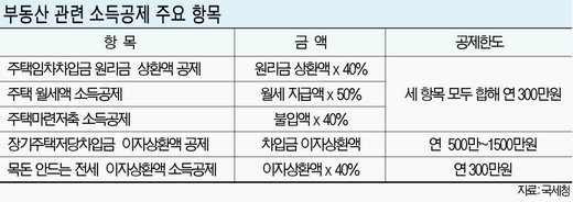지난해 소득분에 대한 연말정산이 15일부터 시작되면서 부동산 관련 소득공제도 눈여겨 볼 필요가 있다. 공제 규모가 다른 항목에 비해 큰 데다 정부가 주거안정을 위해 부동산 소득공제 한도나 대상을 늘린 만큼 쏠쏠한 '13번째 월급'을 받을 수 있기 때문이다.