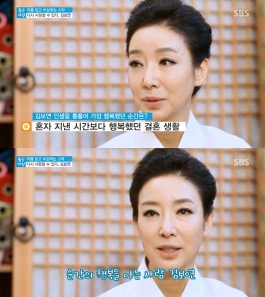 이에 김보연은 “인생에 있어서 행복했던 때가 언제냐고 묻더라. 내 인생을 통틀어 가장 행복했던 순간은 혼자 살 때보다는 결혼을 한 8년에 많지 않았나 싶어서 그렇게 답했다. 행복이라는 것은 딱 꼬집어 말할 수는 없지만 그때가 더 행복했다”고 말했다.