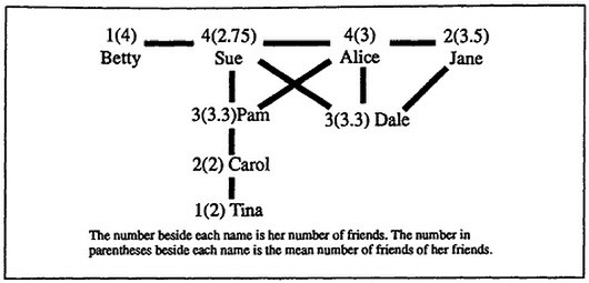 좀 더 자세한 이해는 필드가 제시한 아래의 이미지를 통해 설명할 수 있다. 이름위에 있는 좌측의 숫자는 그 사람이 가진 친구의 숫자를 나타내고, 괄호 안에 있는 숫자는 이들의 친구가 가지고 있는 친구 숫자의 평균이다.