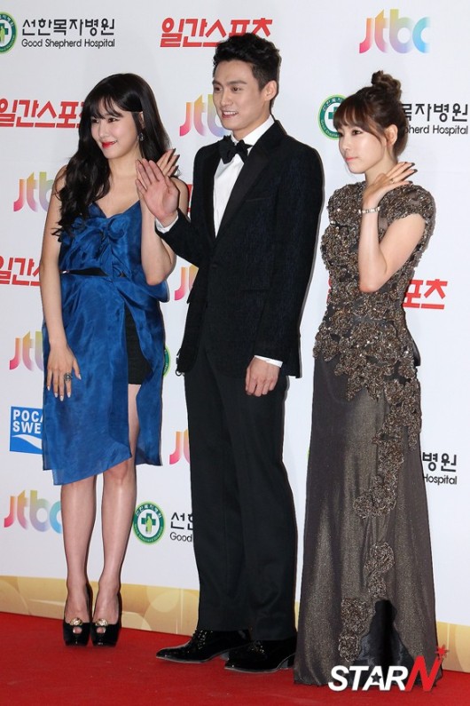 그룹 소녀시대의 티파니, 태연, 배우 오상진이 16일 오후 서울 동대문구 회기동 경희대학교 평화의전당에서 열린 제28회 골든디스크시상식에 참석해 포토타임을 갖고 있다.