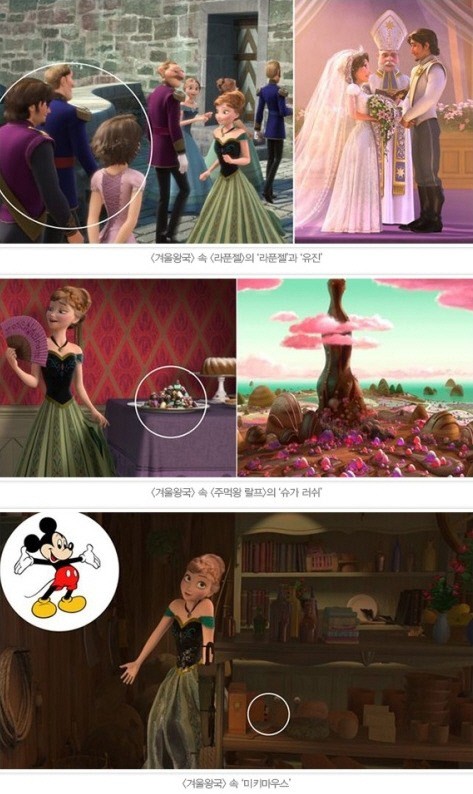 우선 작품 속에서 엘사의 여왕 대관식이 열리는 장면에서 '라푼젤'의 주인공인 라푼젤과 그 등장인물 중 한명이 유진이 하객으로 참석한 것이 발견된다. 앞모습 전체가 아닌 뒷모습만 공개됐지만 눈썰미가 있는 디지니 에니메이션의 팬이라면 발견하기 어렵지 않다.