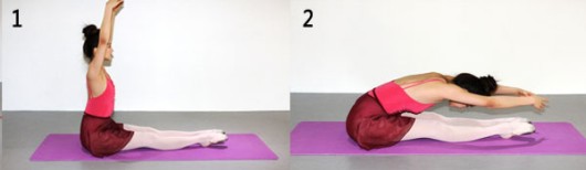 2. 같은 자세를 유지하되, 상체만 서서히 숙여 머리가 최대한 다리에 닿도록 한다.