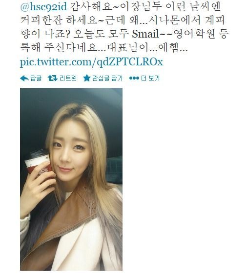수빈은 29일 오후 자신의 트위터를 통해 "감사해요~이장님도 이런 날씨엔 커피한잔 하세요~ 근데 왜 시나몬에서 계피향이 나죠? 오늘도 모두 Smail. 대표님이 영어학원 등록해 주신다네요"이라는 글과 사진을 남겼다.