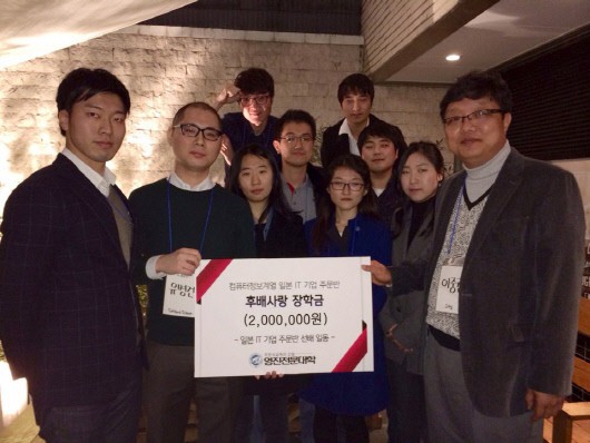 3일 영진전문대 컴퓨터정보계열에 따르면 일본IT기업 주문반 1~4기 출신으로 일본 취업에 성공한 졸업생 32명이 지난달 25일 도쿄 시부야구 모 식당에서 동창회 모임을 열고, 일본 취업을 준비중인 후배들을 격려하기 위한 후배사랑 장학금 200만원을 모금, 이날 행사에 참석한 이중권 컴퓨터정보계열 교수에게 전달했다.