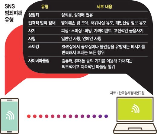 윤해성.박성훈 연구팀은 'SNS 환경에서의 범죄현상과 형사정책적 대응에 관한 연구'자료를 통해 SNS에서 당한 범죄피해 유형을 성범죄, 인격적 법익 침해(명예훼손 및 모욕), 사기, 사칭, 스토킹, 사이버따돌림 등 6가지로 분류했다.