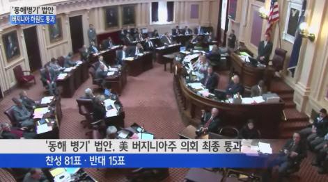 버지니아주 하원은 이날 낮 리치먼드 소재 의회 의사당에서 전체회의를 열어 티머시 휴고(공화) 의원이 발의한 '동해 병기' 법안(HB 11)을 표결에 부쳐 찬성 81표, 반대 15표로 가결처리했다.