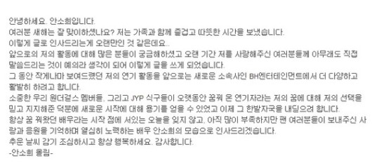 이어진 글에서 그는 “소중한 우리 원더걸스 멤버들 그리고 JYP 식구들이 오랫동안 꿈꿔 온 연기자라는 저의 꿈에 대해 저의 선택을 믿고 지지해준 덕분에 새로운 시작에 대해 용기를 얻을 수 있었고 이제 그 한발자국을 내딛으려 합니다.”라며 “항상 꿈 꿔왔던 배우라는 시작 점에 서있는 오늘을 잊지 않고, 아직 많이 부족하지만 팬 여러분들이 보내주신 사랑과 응원을 기억하며 열심히 노력하는 배우 안소희의 모습으로 인사드리겠습니다.”라는 말로 장문의 글을 마무리했다.