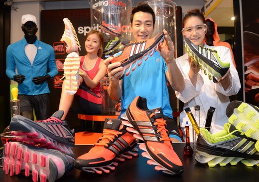 아디다스는 16일 서울 아디다스 명동 플래그십 내 '이노베이션 랩'에서 '스프링 블레이드' 러닝화 출시행사를 개최했다. 스프링 블레이드는 밑창에 경사진 형태의 하이테크 폴리머로 만든 16개의 고탄력 블레이드를 적용, 발 밑에 스프링이 있는 것과 같은 추진력을 느낄 수 있다.