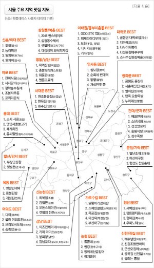 지도의 특징은 직장인이 많은 광화문/서대문의 경우 곰평동 꼼장어(꼼장어), 서촌계단집(해산물) 등 소주 한잔을 겸할 수 있는 맛집이 상위 랭크된 반면, 학생들이 많은 신촌-홍대 지역은 윤씨밀방(함박스테이크), 소프트리(아이스크림), 신촌수제비 등 저렴한 분식집, 디저트 맛집이 상위에 랭크 된 점이다. 관광객이 많은 인사동의 경우 삼보당(호떡), 똥빵(풀빵) 등 길거리 맛집이 전체 서울 지역 중에서 유일하게 상위에 랭크되며 명물이 된 인사동 길거리음식의 파워를 느낄 수 있게 해준다.