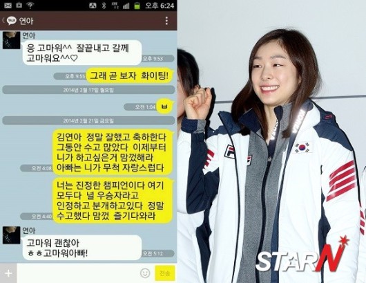 공개된 사진 속에는 김연아가 아버지와 나눈 카카오톡 대화내용이 담겨 있으며, 특히 김연아의 프리스케이팅 경기가 있던 21일 김연아의 아버지는 경기가 끝나자마자 “김연아 정말 잘했고 축하한다 그동안 수고 많았다. 이제부터는 니가 하고 싶은 거 맘껏 해라 아빠는 니가 무척 자랑스럽다”라고 메시지를 보내 훈훈함을 자아냈다.