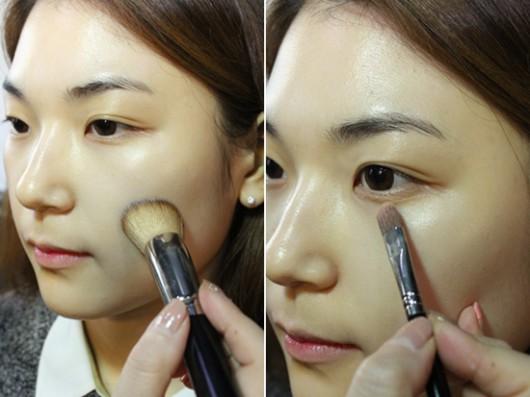 1) 얼굴과 목, 쉐이딩 부분이 쓰리톤이 되지 않도록, 어두운 파우더를 사용해 1차 쉐이딩을 넣어준다. 촉촉한 상태에서 쉐이딩을 하면 뭉칠 수 있으므로 파우더로 촉촉함을 잡아주는 것이 좋다. 파우더를 칠한 후에는 쉐이딩 아이템을 활용해 안쪽 부분을 칠해 마무리한다.