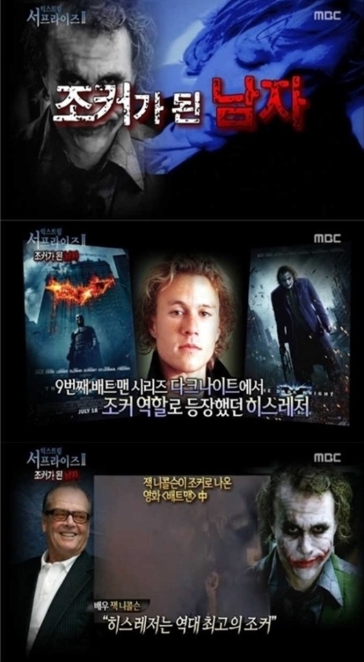 2일 방송된 MBC ‘서프라이즈’에서는 영화 ‘베트맨’ 시리즈 인 ‘다크나이트’에서 조커 역할을 맡았던 히스 레저의 죽음과 관련된 이야기가 공개돼 눈길을 끌었다.