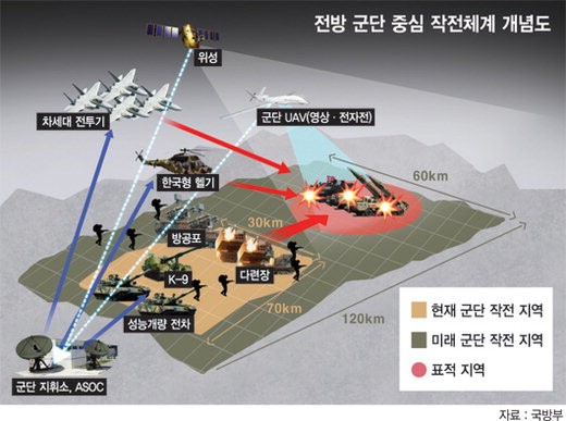 국방부가 6일 박근혜 대통령에게 보고한 '국방개혁 기본계획(2014∼2030년)'에서 현재 야전군 사령부 중심인 군 작전체계를 5년 이내에 전방 군단 중심으로 개편키로 함에 따라 전방 군단 중심의 작전체계가 어떻게 짜여지는지에 관심이 쏠리고 있다.