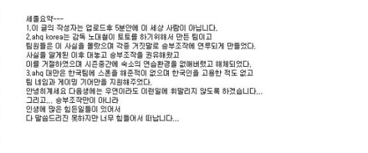 해당 글에 따르면 노대철 감독은 AHQ 코리아 소속선수들에게 “온게임넷에서 대기업 팀에게 져줄 것을 요구했다”는 거짓말을 앞세워 승부조작에 가담하게 했고, 이후 선수들이 이를 눈치 채자 대놓고 승부조작의 가담을 강요했다.