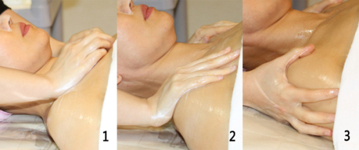 쇄골 라인 마사지를 위해 에센스나 오일을 손에 듬뿍 묻힌 뒤 쇄골 아래부터 가슴까지 양쪽으로 쓸 듯이 마사지한다. 손가락 끝을 쇄골 중앙에 대고 안쪽에서 바깥쪽을 향해 문지르는 것이 요령. 이 동작을 5번 정도 반복 후 같은 방법으로 바깥쪽에서 안쪽을 향해 문지르면 쇄골 아래의 림프가 자극돼 혈액 순환이 촉진되고 몸이 따뜻해진다.