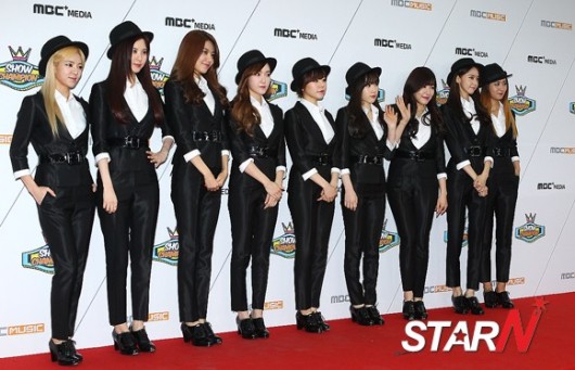 걸그룹 소녀시대가 19일 오후 경기 고양시 일산동구 장항동 일산 빛마루 방송지원센터에서 열린 MBC MUSIC '쇼 챔피언’ 100회 특집 포토월 행사에 참석해 포즈를 취하고 있다.