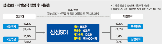 하지만 삼성전자가 최대주주인 삼성SDI가 제일모직을 흡수하면 △이재용 부회장을 중심으로 한 전자.금융 계열사 △이부진 사장이 맡고 있는 호텔.건설 계열사 △이서현 사장의 패션.미디어 계열사 체제가 보다 확고해진다. 합병 후 삼성SDI의 지분구조는 삼성전자(13.5%)가 최대주주로 올라서고, 국민연금(10.5%)보다 높아지기 때문이다.