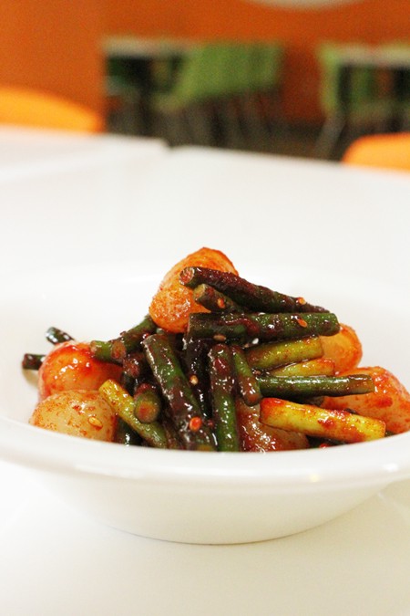 3. 데친 마늘쫑과 락교를 볼(bowl)에 넣은 뒤 양념장을 부어 버무린다. 통깨를 뿌려 섞어주면 완성.