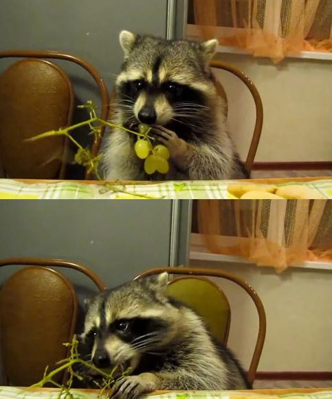 공개된 영상에는 너구리가 의자에 앉아 식탁에 놓인 청포도를 한 알씩 떼어 먹는 모습이 담겨 있다.