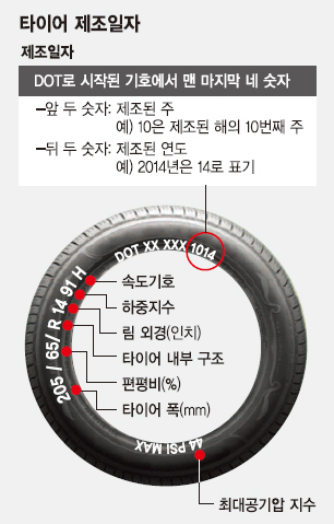 먼저 타이어 사이드에는 제조일자가 기입돼 있다. 'DOT'라는 영문으로 시작하는 표기에서 뒤에 네자리 숫자가 바로 제조일자다. 앞 두자리는 제조된 해의 해당 주를 뜻하며 뒤의 두자리는 제조연도의 끝 두자리 숫자를 의미한다. 예를 들어 '1014'는 2014년 제10주에 생산되었음을 뜻한다.