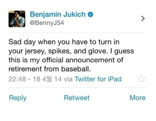 그는 “당신이 당신의 유니폼과 스파이크, 글러브를 반납해야 한다면 슬픈 날이다. 이것은 아마 내가 야구에서 은퇴하는 공식 발표가 될 것”이라는 글을 올렸다.