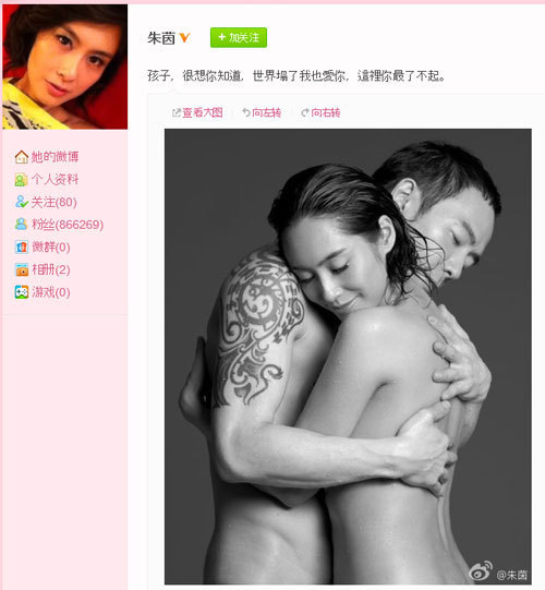 홍콩 여배우 주인(朱茵 40)이 누드로 임신을 발표해 화제다.