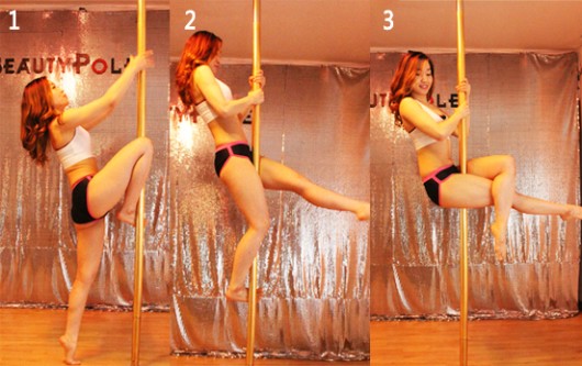 속근육을 발달시켜 탄탄한 몸매를 만들어 주는 '클라임 투 틱톡 싯'은 폴에 두 허벅지를 붙인 채로 버텨야 하기 때문에 하체비만이 고민인 사람에게 제격인 동작이다.